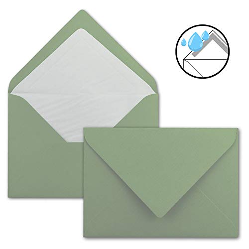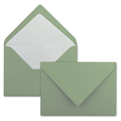 Set di 50 biglietti pieghevoli, formato DIN B6, 12 x 17 cm, 120 x 170 mm, con buste e foglie, struttura a coste, superficie verde oliva