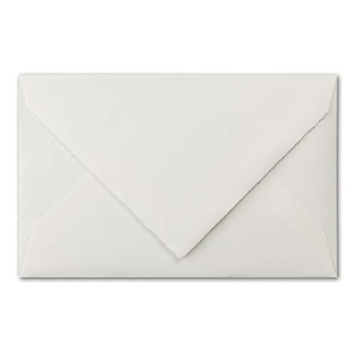 Buste: 11,8 x 18,2 cm, equivalenti circa al formato B6 - grammatura: 105 g/m² - buste di alta qualità con bordo lavorato a mano e pregiata finitura pergamenata, con gommatura e adesivo da inumidire. Classica chiusura triangolare.