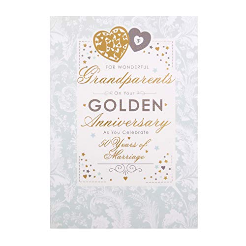 50 anni di matrimonio sono un'impresa incredibile e una che dovrebbe essere celebrata da tutta la famiglia, quindi mostra ai tuoi nonni quanto sei orgoglioso con questo elegante biglietto d'auguri dorato di Hallmark.