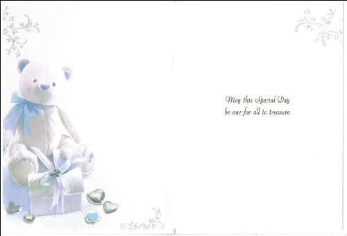 Biglietto con orsacchiotto bianco, nastro blu e scritta in lingua inglese: “On your Christening Day with love”.