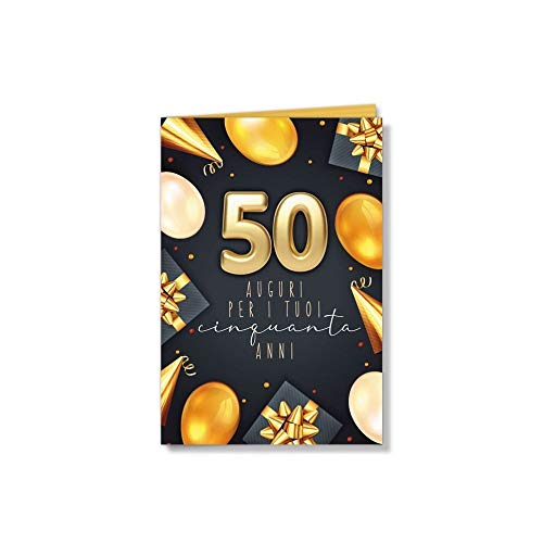 Biglietto Auguri Compleanno NUMERO 50 ANNI Sfondo nero e palloncini oro