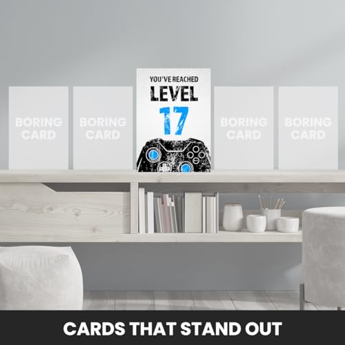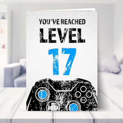 Questo biglietto di compleanno per ragazzo o ragazza è perfetto per un bambino che sta compiendo 17 anni. Adatto a qualsiasi destinatario tra cui figlio, nipote, pronipote, cugino o fratello. Progettazione di videogiochi grunge con il seguente testo: Hai raggiunto il livello 17. Questo biglietto di compleanno da gioco per ragazzi di 17 anni gli farà sorridere in quel compleanno speciale.