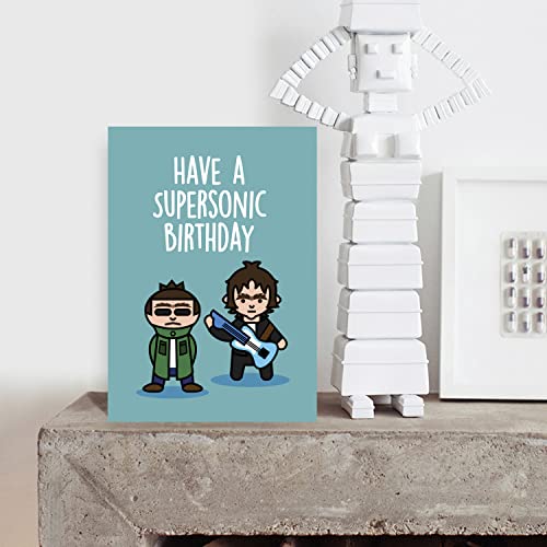 Biglietto di compleanno divertente Oasis Noel Liam Gallagher marito, fidanzato, papà, fratello, saluto per lui, lei, felice, scherzo con scritta "Have a Supersonic Birthday"