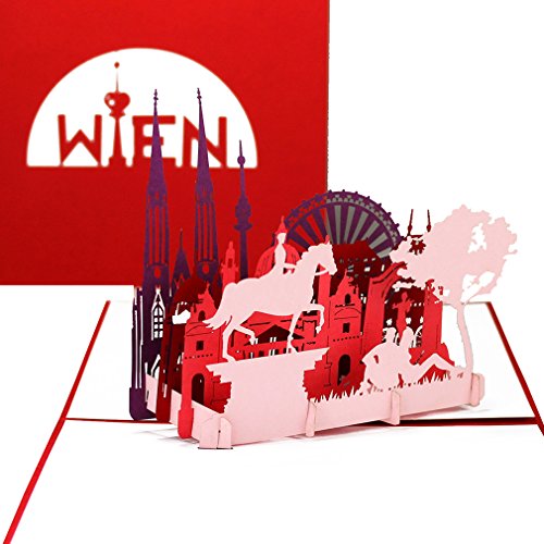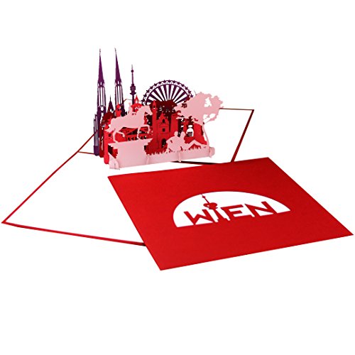 In pregiato rosso, questo biglietto pop-up 3D di Vienna è un meraviglioso piccolo regalo. Quando si apre il biglietto pieghevole si apre una splendida vista panoramica dello skyline di Vienna con ruota panoramica/Prater. Una piccola opera d'arte in carta che entusiasmerà come souvenir, invito per un viaggio in città, buono di viaggio e come biglietto di compleanno!