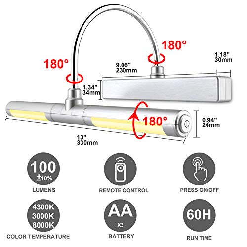 3 modalità di illuminazione e batteria Luci a Pittura Parete: funziona con 3 batterie AA (non incluse). Ogni lampada a specchio ha 12 LED super luminoso, 100 lumen, 3 modalità di illuminazione a scelta (3000 K bianco caldo, 4300 K bianco naturale, 8000 K bianco freddo).