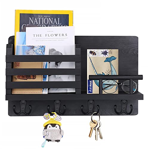 BIGLUFU Portachiavi da Parete Nero, Organizer per Chiavi a Parete e Organizer per Posta con Bacheca, Porta Chiavi in Legno e Porta Lettere con 4 Ganci per Chiavi per Ingresso, Casa e Ufficio