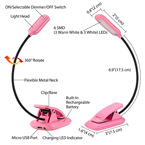 BIGMONAT Luce da lettura ricaricabile a clip per libri a letto, luce dimmerabile, luce da lettura per libri a letto, luce per libri per bambini, luce per studiare, lampada da lettura notturna, rosa