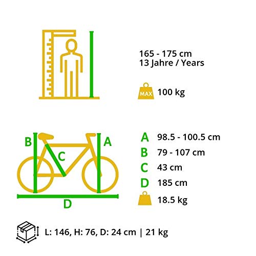 LEGGERO, STABILE E SICURO: Telaio in alluminio molto robusto per l'uso quotidiano in montagna, per la scuola o il lavoro. Gli pneumatici da 29 pollici e il telaio da 17 pollici sono adatti per ragazzi e ragazze, ma anche per adulti di altezza compresa tra 165 cm. Il telaio da 19" è adatto a persone con un'altezza di 175 cm o più. Questa mountain bike è disponibile anche con pneumatici da 26 pollici e 29 pollici con diverse altezze del telaio