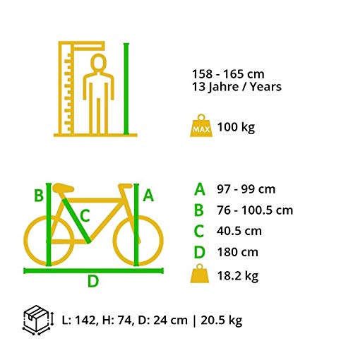 LEGGERO, STABILE E SICURO: Telaio in alluminio molto robusto per l'uso quotidiano in montagna, per la scuola o il lavoro. Pneumatici da 27,5 pollici e telai da 14 pollici sono adatti per altezze di 148 cm o più. Il telaio da 16 pollici è adatto a persone che sono alte 158 cm o più. Il telaio da 18 pollici è adatto a persone che sono alte 168 cm o più. Questa mountain bike è disponibile anche con pneumatici da 26 pollici e 29 pollici con diverse altezze del telaio