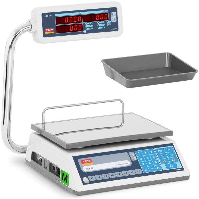 La bilancia da banco elettronica con schermo LED duale tre colori di marca TEM ✅ Modello: TEL030BC1-B1 ✅ Articolo: 10200052 ⬇️ Caratteristiche principali Pronta all'uso: tarata, calibrata e adatta al commercio. Precisa: precisione di pesata della classe III delle bilance per il commercio con max. 30 kg. Chiara: display a LED moderno duale con cifre alte 15 mm. Resistente: lunga durata della batteria fino a 40 ore oppure funzionamento tramite alimentatore. Interfaccia: RS 232 (cavo incluso nella spedizione) e i protocolli DIALOG 06, TEM, TISA, DELTA, CAS (NCI), ACLASS. ⬇️ Dettagli tecnici Divisione [g] 3000 Protocollo DIALOGO 06, TEM, TISA, DELTA, CAS (NCI), ACLASS Precisione W1 5 g (15 kg) Precisione W2 10 g (30 kg) Classe di precisione III Unità di peso kg Accuratezza/Precisione [kg] W1: 5 g / W2: 10 g Temperatura di stoccaggio [°C] -10 - 40 Dettagli alimentazione Alimentazione: 7,8 V / 1,2 A CA / 110 - 230 V / 50 Hz Colore Blu, Argento, Bianco Schermo LED Alimentazione