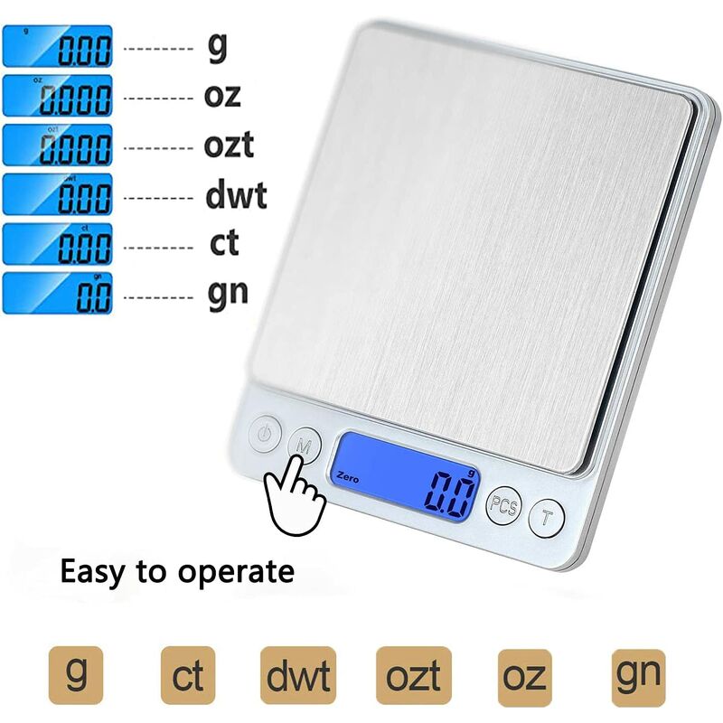 Preciso e sensibile: Il sistema di sensori ad alta precisione integrato può fornire risultati immediati e accurati. Il campo di misurazione va da 0,1 g a 3000 g, la massima precisione è di 0,01 once, il pulsante tara preciso, facile da calcolare il peso netto degli ingredienti, molto adatto per misurare acqua, latte, polvere e altre sostanze. < p> Superficie della bilancia in acciaio inossidabile: buone prestazioni impermeabili, facile da pulire e da usare, che la rende la scelta ideale per famiglie e cucine. Design semplice (dimensioni del prodotto: 5" x 4,2" x 0,6") è molto portatile e può essere portato in giro. Una varietà di unità di misura: può essere liberamente commutata tra g/ct/dwt/ozt/oz/gn premendo il pulsante. Display LCD: Lo schermo LCD retroilluminato blu chiaro integrato consente di leggere facilmente e chiaramente. La funzione di spegnimento automatico dello schermo entro 180 secondi è a risparmio energetico ed ecologica. La batteria è facilmente accessibile senza un