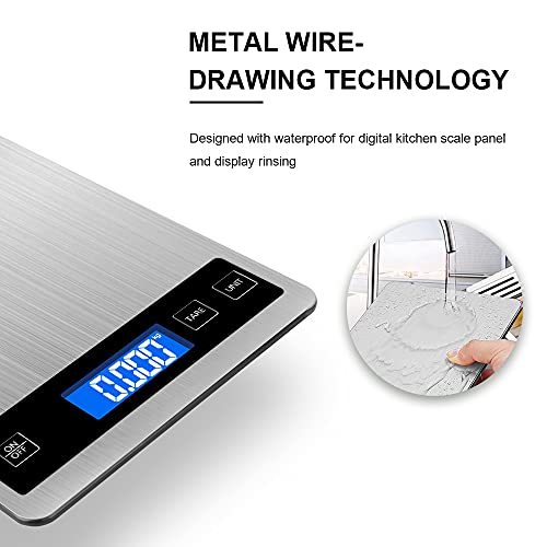 【Bilancia Cucina Digitale Professionale】Si può collocare il piatto o la ciotola. Il pannello in alluminio spazzolato è impermeabile e facile da pulire con un panno umido. Altre funzioni di bilancia di precisione: Sonno automatico senza operazione entro 2 minuti (può chiuderla manualmente), prompt di batteria scarica con Indicazione LED e sovraccarico.