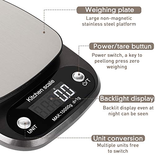 【Precisione di misurazione】dotato di 4 sensori di alta precisione importati,che forniscono peso accurato, capacità di 10 kg,partizione 0,01 g / 1 g,ideale per misurare,cuocere al forno,cuocere al forno,ecc. Molto adatto per misurare ingredienti,gioielli,riso,farina,oro,pietre preziose,lettere,francobolli possono soddisfare le tue esigenze quotidiane.