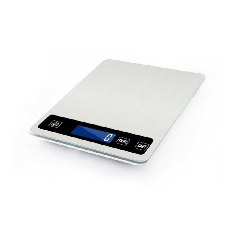ampio display LCD retroilluminato per una lettura ottimale delle misure.Questa bilancia da cucina ha il piano liscio in acciaio inox che ne permette una facile pulizia;