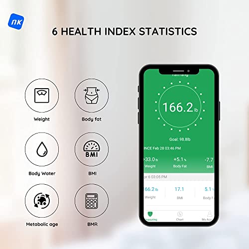 ✅ MISURAZIONI ESSENZIALI DEL CORPO: la bilancia intelligente NK determina il grasso corporeo e può analizzare 6 statistiche sull'indice di salute, come peso, grasso corporeo, acqua corporea, BMI, età metabolica e BMR. È un analizzatore corporeo che misura il peso e utilizza la tecnologia di analisi dell'impedenza bioelettrica per stimare la percentuale di grasso corporeo e altri dati sulla composizione corporea. È inteso solo per uso domestico.