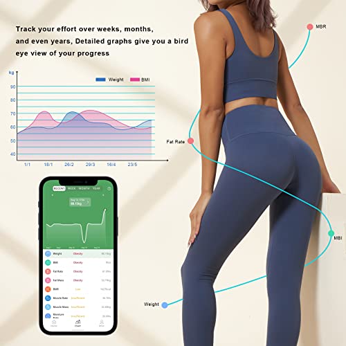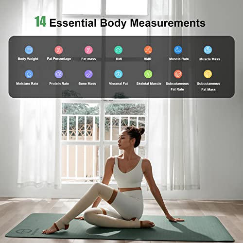 【14 misurazioni essenziali】 La bilancia intelligente del grasso corporeo dotata di tecnologia di analisi dell'impedenza bioelettrica (BIA), che fornisce misurazioni corporee per peso, tasso di grasso, massa grassa, BMI, BMR, massa ossea, tasso proteico, massa muscolare, frequenza muscolare, tasso di umidità, muscolo scheletrico, grasso viscerale, tasso di grasso sottocutaneo, massa grassa sottocutanea. Le misurazioni sono memorizzate nell'app, facilitando il monitoraggio dei dati.