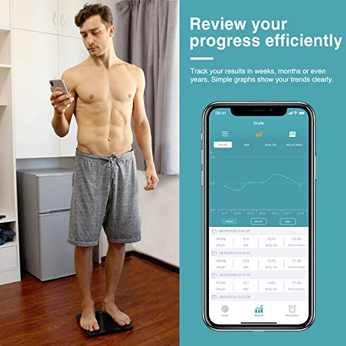 Monitora i Tuoi Progressi - La bilancia digitale del peso corporeo si collega alle App per aiutarti a stabilire obiettivi, registrare dati storici e tenere traccia dei tuoi progressi giornalieri, settimanali e mensili. Per selezionare i dati dai periodi di tempo specif