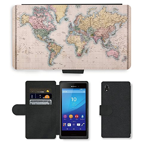 PU Billetera de Cuero Caso Titular de la tarjeta Carcasa Funda para // V00002415 Proiezione Mercator Mondiale Vecchio // Sony Xperia M4 Aqua