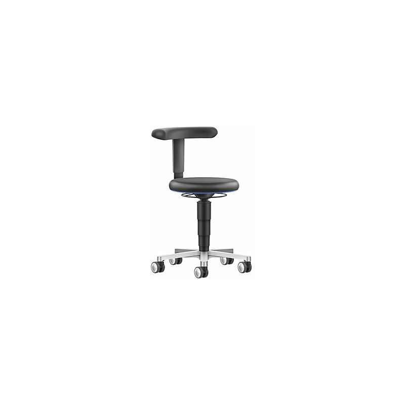 Sgabello da laboratorio con supporto flessibile, con rotelle, regolabile in altezza, anello blu. Fornitura = in parte smontato. Materiale sedile = similpelle. Versione telaio = con rotelle. Materiale telaio = alluminio. Colore telaio = argento. Tipo di regolazione dell'altezza = pompa a gas con anello. Colore sedile = blu, nero. Altezza sedile = 450 - 650 mm. Diametro sedile = 400 mm. Dotazione = con supporto flessibile. Portata = 120 kg. Diametro del piede = 540 mm. Diametro rotelle = 65 mm. Versione rotelle = rotelle morbide per superfici dure. Tipo di prodotto = sgabelli da lavoro. Con supporto flessibile regolabile in altezza che sostiene sia la schiena che le braccia. Altezza regolabile con molla a gas tramite pratico anello di azionamento. Anello colorato per imbottire e proteggere i bordi, durevole. Salvaspazio grazie al basamento a razze sagomato e compatto con Ø 540 mm. Grande cuscino rotondo con imbottitura comfort extra spessa. Imbottiture lavabili e resistenti ai