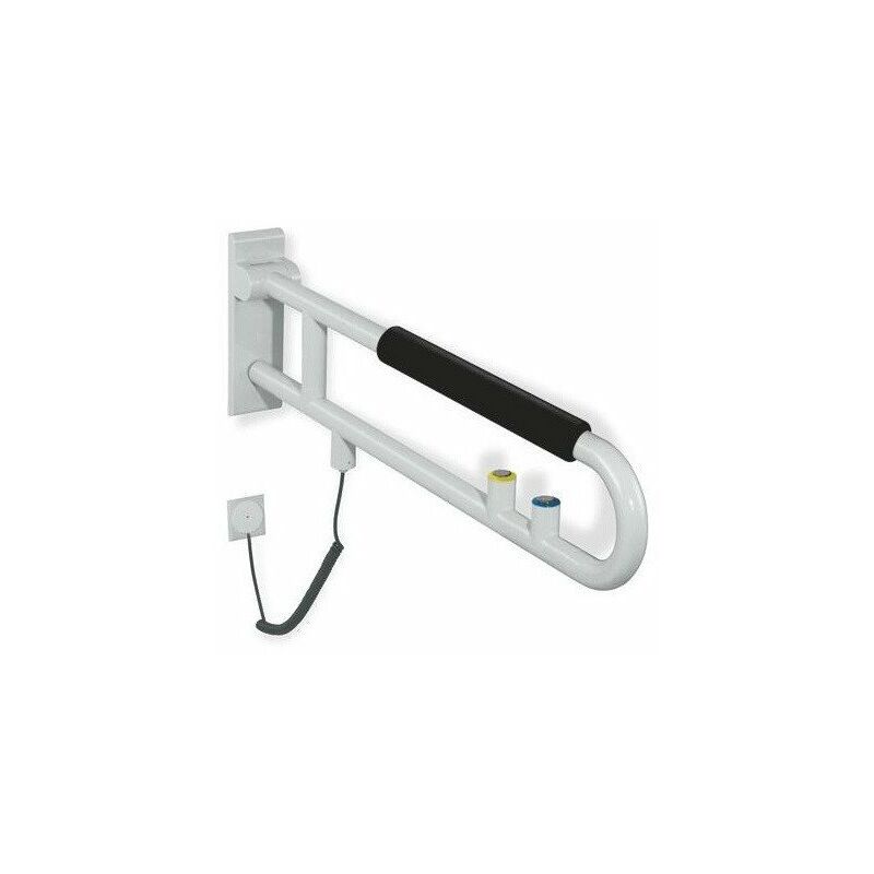 Con cuscino a braccio in PUR nero, due aste parallele disposte l'una sopra l'altra, unite tra loro da una lastra di collegamento con due pulsanti integrati, caricabili secondo DIN 18024, possono essere piegate verso l'alto e frenate verso il basso, con nucleo in acciaio continuo e protetto dalla corrosione e piastra a parete in poliammide con nucleo in acciaio integrato, materiale di fissaggio HEWIing nascosto, privo di corrosione e testato per diverse strutture a parete, largo 78 mm e alto 259 mm, aste Ø 33 mm, pulsante con anello blu per l'attivazione dello sciacquone del water, pulsante con anello giallo per attivare una funzione liberamente definibile, pulsanti con classe di protezione IP67, cavo a spirale con terminazioni a linea libera per il collegamento a parete, incluso coperchio bianco per scatola montata a filo, tensione di controllo max. 30 V = SELV, PELV, corrente di commutazione fino a max. Controllo, in poliammide