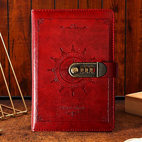 Bindundun Diario Segreto con Codice,taccuino vintage in pelle con motivo nautico,Diario con lucchetto, password Notebook con penna, adatto per diario personale con codice di viaggio (Rosso marrone)