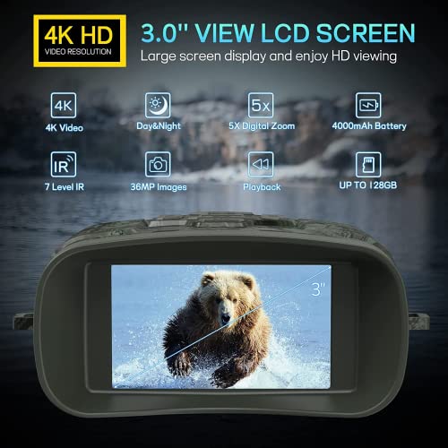 【4K Video e 36MP immagini Visione Notturna】Lo schermo del binocolo visione notturna è uno schermo LCD TFT ad alta definizione da 3.0” che supporta la risoluzione HD 4K (4096 x 2160) / 36MP e lo zoom digitale 5X,Questo visore notturno può darti un'esperienza visiva eccellente, non importa che sia giorno o notte, puoi facilmente catturare momenti meravigliosi.