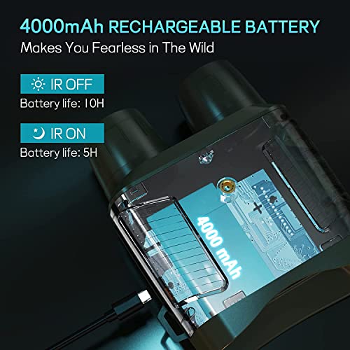 【Binocolo Visione Notturna Ricaricabile da 4000mAh】Gli binocoli per la visione notturna digitali hanno una batteria ricaricabile integrata, che ti libera dal carico di trasportare più batterie AA. Può essere ricaricato in qualsiasi momento con un power bank e un caricabatteria per auto. Per i binocoli per la visione notturna a infrarossi, la luce a infrarossi può essere utilizzata fino a 5 ore se accesa al livello 7 e può funzionare fino a 10 ore durante il giorno.