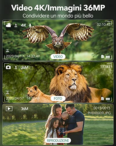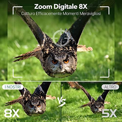 【Binocolo con Visione Notturna 4K & Messa a Fuoco Nitida】È possibile acquisire video UHD 4K con registrazione del suono e foto da 36MP di giorno, in condizioni di scarsa illuminazione o di notte. Supporta anche la funzione di riproduzione. Grazie allo zoom digitale 8X, sarà più facile trovare e osservare qualcosa di lontano.