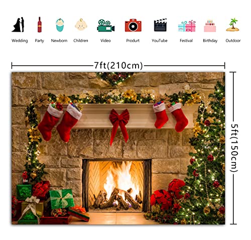 BINQOO 2,1 x 1,5 m Natale camino albero calzino fondale albero di Natale rosso calzino regali Santa Garland palla partito fotografia sfondo stand Decor puntelli
