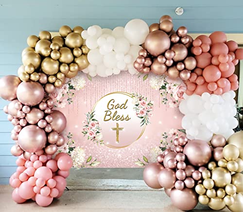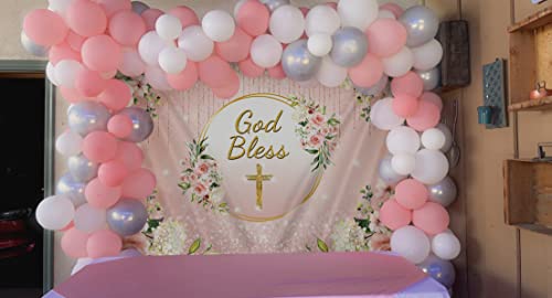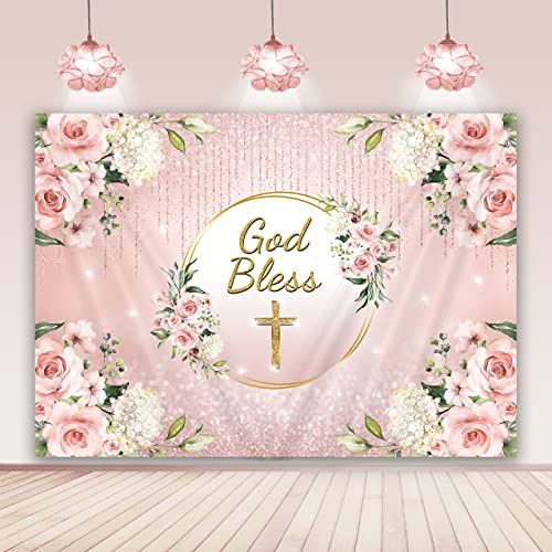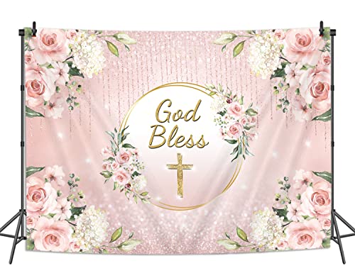 BINQOO 2,1 x 1,5 m Rosa Dio Benedica Sfondo Ragazza Battesimo Festa Prima Comunione Battesimo Banner Rosa Dorato Floreale Croce Sfondo Compleanno Baby Shower Forniture Bomboniere Regali Photoshoot