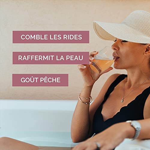 Formule INCI: Hydrolysat de collagène de poisson (5 g) - Fructose - Acide citrique, citrate de sodium (acidifiants) - Arôme naturel de pêche - Carbonate de magnésium, dioxyde de silicium, maltodextrine de blé (antiagglomérants) - Béta-carotène, jus concentré de betterave rouge (colorants) - Acésulfame de potassium, sucralose (édulcorants).