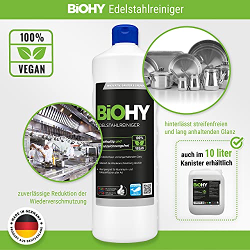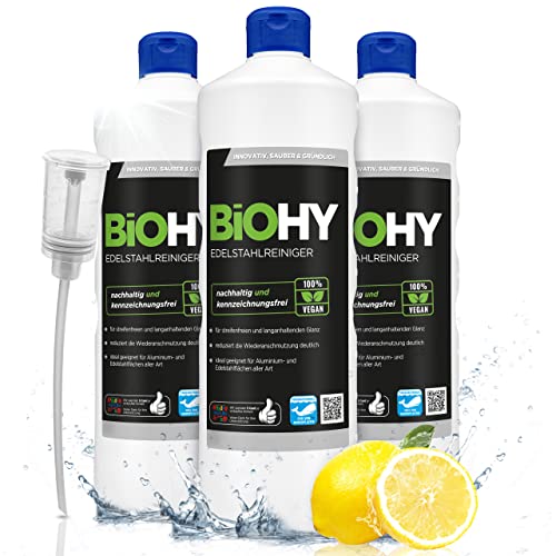 BiOHY Detergente per acciaio inossidabile (3 bottiglie da 1l) + Distributore | Cura dell'acciaio inossidabile per una nuova lucentezza senza striature (Edelstahlreiniger)