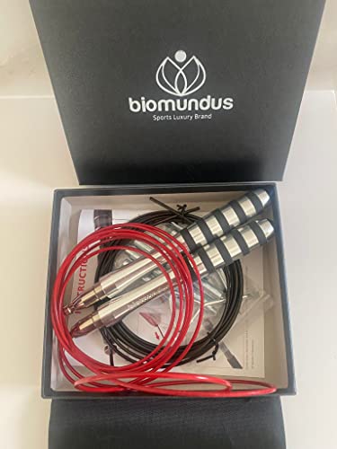 Biomundus Corda per Saltare Professionale Corda Crossfit Regolabile de Alta velocità - 2 Cavi di Ricambio - Speed Jump Rope de Alluminio e Luce con Cuscinetti a Sfere di Alta qualità Rosso e Nero