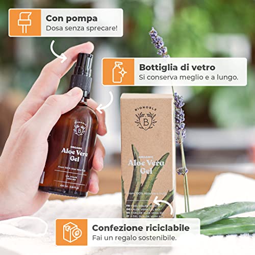 Bionoble Aloe Vera Gel Puro Bio 100ml - Realizzato con Polpa di Aloe Vera Fresca e Pura al 100% e con Lavanda Bio - Senza Xantano - Viso, Contorno Occhi, Corpo, Capelli - Bottiglia di Vetro + Pompa