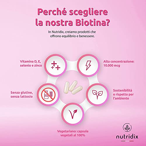 BIOTINA CON ZINCO, SELENIO E VITAMINE. La biotina Nutridix ha nella sua formula la presenza di minerali come lo zinco e il selenio. Inoltre, vengono aggiunte le vitamine D ed E, che completano una combinazione di ingredienti variegati e 100% vegetariani.