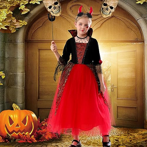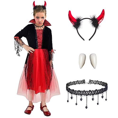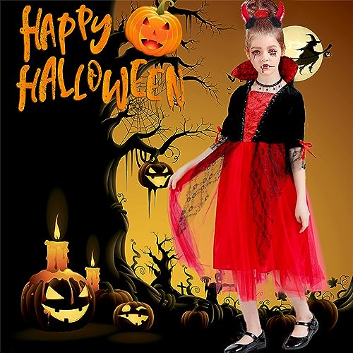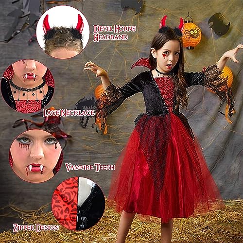 BIQIQI Costume da vampiro per Bambina Costume di Halloween Vestito Vampiro Bambina con Corna da Diavolo Collana Denti da Vampiro per Ragazze 4-8 anni Carnevale di Halloween Festa a Tema Vampiro
