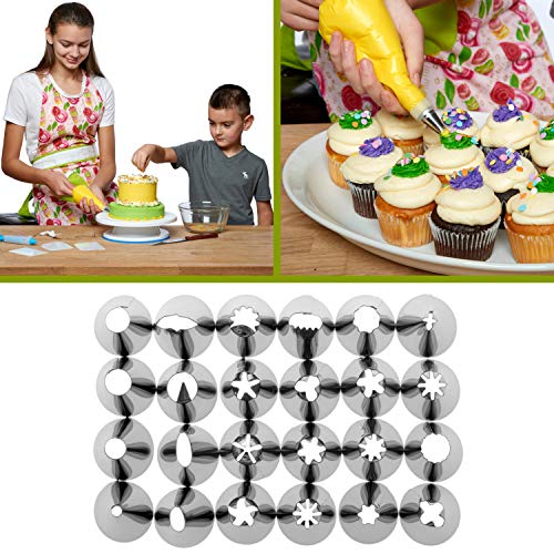 Cosa c'è dentro? Tutto ciò di cui hai bisogno per trasformare una torta in una fantastica torta: girevole a 360°, con base in silicone antiscivolo, 24 beccucci, 3 punte russe, adattatori a spirale standard e 3 colori, spatole dritte e angolate, affettatrici, raschietti, penna per modellare unghie e sollevare, 2 sacchetti riutilizzabili e 30 sacchetti usa e getta per pasticceria mini per cioccolato.