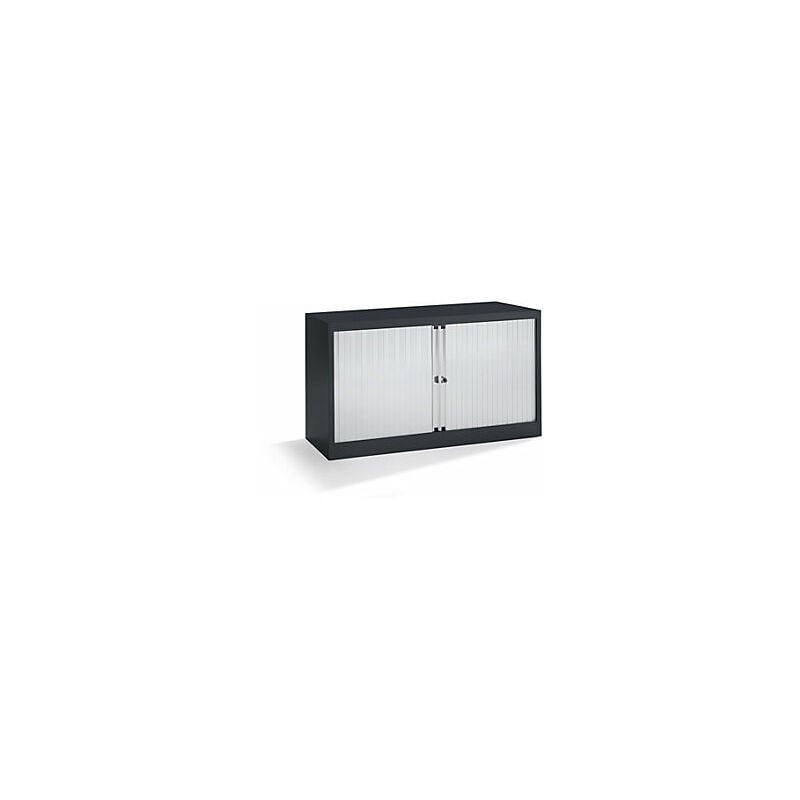 Armadio a serranda Euro, larghezza 1200 mm, 1 ripiano, nero notte / grigio chiaro. Fornitura = montato. Altezza = 695 mm. Larghezza = 1200 mm. Profondità = 430 mm. Colore corpo = nero notte. Materiale corpo = lamiera d'acciaio, verniciata a polvere. Colore serranda = grigio chiaro. Caratteristiche = con serratura. Serratura = serratura a cilindro con 2 chiavi. Numero file raccoglitori = 1.5 pz. Materiale serranda = plastica. Dotazione interna = 1 ripiano. Numero ripiani = 1 pz. Portata per ripiano = 65 kg. Colore ripiani = nero notte. Tipo di porta = serranda orizzontale. Passo di regolazione altezza ripiani = 25 mm. Larghezza interna = 1046 mm. Altezza interna = 568 mm. Profondità interna = 395 mm. Spessore ripiani = 23 mm. Spessore del corpo = 0.8 mm. Completi di ripiani in acciaio. Con serratura. Le serrande scompaiono completamente nel corpo. Maniglia a listello nel colore della serranda. Corpo in lamiera d'acciaio spessore 0,8 mm con verniciatura a polvere strutturata e piedini ad
