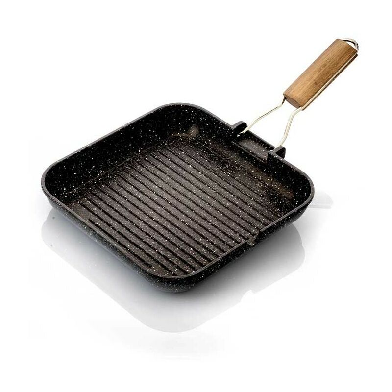 Bistecchiera con manico pieghevole in alluminio pressofuso ad elevato spessore con rivestimento antiaderente di estrema qualità. Dimensioni: 26×26 cm o 35x26