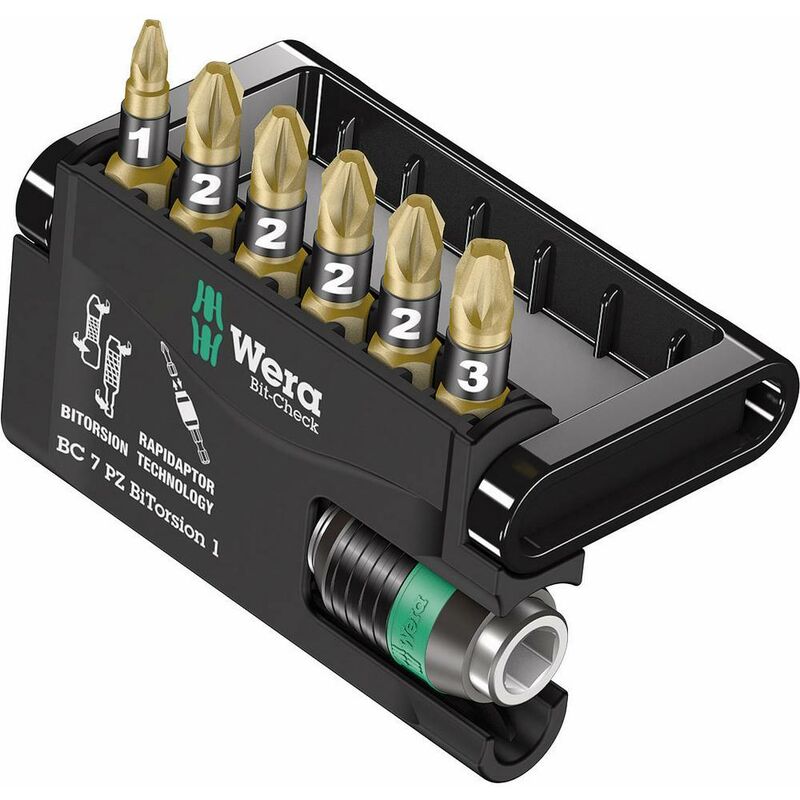 Dettagli tecnici Caratteristiche (inserti) BiTorsion Contenuto 1 pz. Dimensione del prodotto, lunghezza 25 mm Forma (inserti) D 6.3 Forza Croce Pozidriv Impronta (cacciavite) 1/4 (6.3 mm) Materiale Acciaio per utensili Proprietà del materiale extra duro Tipo prodotto Kit inserti Bit-Check 7 PZ BiTorsion 1, 7 pezzi 6 bit BiTorsion in extra duro. Portabit con mandrino a cambio rapido per l'alloggiamento di Bit in conformità con DIN ISO 1173-C 6.3 e 6.3. Testo tradotto automaticamente. Punti di forza e dettagli Bit con codifica a colori Incluso nella consegna A croce PZ 1/4 x PZ 2/PZ 3 Portabit con mandrino a cambio rapido. Requisiti di sistema null
