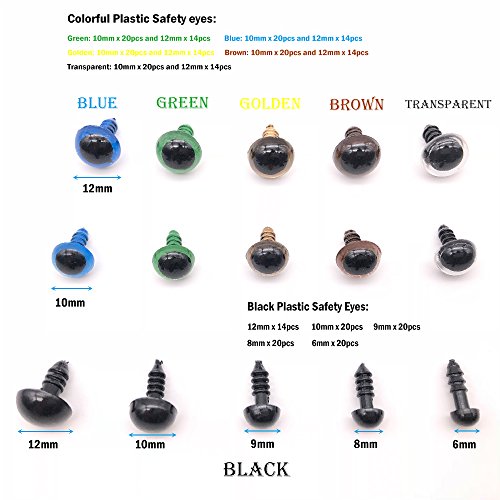 Articolo contiene:Colorati occhi di sicurezza(verde,blu,d'oro,marrone,trasparente)Ogni colore:10mm x 20pezzi,12mm x 14pezzi.94pezzi 6-12mm nero occhi di sicurezza.