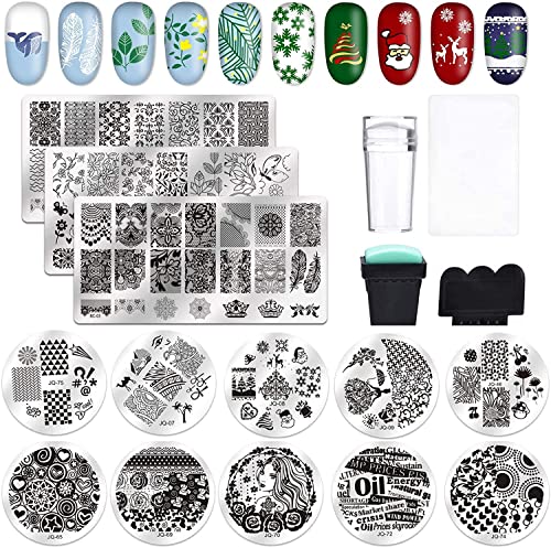 Biutee 13 Pcs di Nail Plates, inclusi 10 Pcs Piastre per Unghie Rotonde, 3 Piastre Rettangolari, 2 Set di Raschietti Per Unghie e Timbri, Mazzi Di in Metallo per Tatuaggi Nail Art