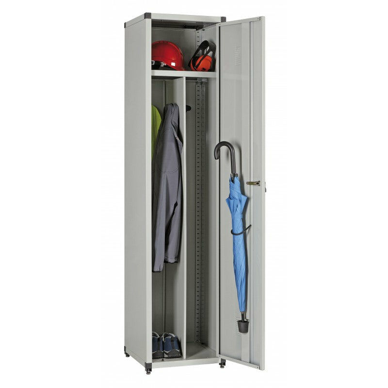 BRICO 7 SPOGLIATOIO: cm 43x44x183h, pianetto in metallo, divisorio pulito e sporco, portaombrelli . Colore grigio RAL 7038 Utilizzo: questi MOBILI COMPONIBILI costruiti dalla Bizzotto Scaffalature nascono per soddisfare esigenze domestiche e non, per archiviare documenti, prodotti, attrezzature importanti da custodire al riparo da polvere e in sicurezza in quanto ogni armadio è provvisto di chiusura con chiave. Materiali: I mobili sono robusti e duraturi in quanto costruiti in acciaio laminato a freddo di qualità DC01 secondo la norma EN 10130. Ricavati da nostre linee di profilatura che consentono di ottenere profili particolarmente robusti grazie a particolari pieghe supplementari nei bordi dei fianchi. Caratteristiche: I mobili si possono montare senza l'ausilio di attrezzi in quanto vengono già forniti premontati. L'imballo è composto da una scatola in cartone pratica al trasporto ed esteticamente gradevole.