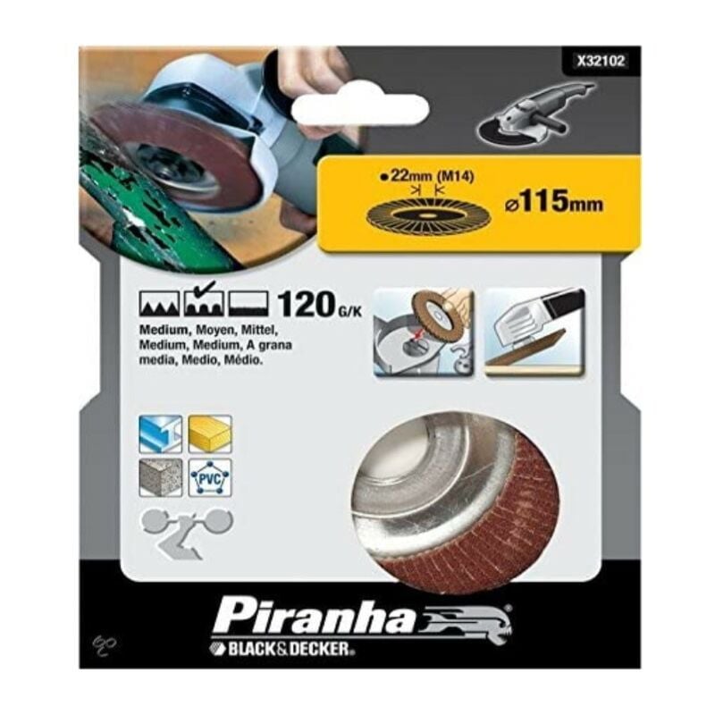 BLACK&DEKER - PIRANHA - DISCO ABRASIVO LAMELLARE / MOLA RADIALE PER SMERIGLIATRICE ANGOLARE Ø115x22MM - GRANA 120 Caratteristiche: Il disco abrasivo lamellare Piranha k120 medio x32102-xj 115mm è adatto a quasi tutte le comuni smerigliatrici angolari. Il disco abrasivo ha una grana 120 per una finitura media. Diametro: 115 mm. Grossezza: media grossolana Materiale superficie target:Legno non trattato, Metallo, Legno trattato