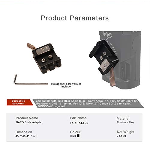 Tilta nuova versione maniglia laterale abbinare 6 diverse parti di blocco (non incluse). Il cliente può acquistare la parte di blocco adatta secondo la fotocamera. Queste parti di blocco possono essere montate solo su maniglia nuova versione Tilta come TA-LFH-57-B e TA-LRH-57-B. La parte di blocco non è compatibile con altri modelli di maniglie di marca.