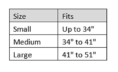 tre taglie: S (fino a 86,4 cm), Medium (fino a 104,1 cm), L (104,1 - 129,5 cm). Dimensioni 86,4 cm, 104,1 cm e 104,1 - 129,5 cm cita girovita e non Belt size