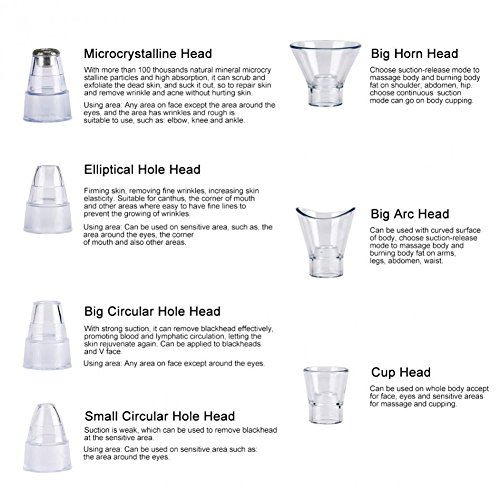 7 testine per diversi usi - 4 sono utilizzati principalmente come viso di aspirazione detergente: testa microcristallina agire sulla esfoliante e altri tre hanno diverse dimensioni di foro lavorando su diverse parti.3 può essere usato come coppettazione per anti-invecchiamento e Wrinkle Reducer, per migliorare la circolazione