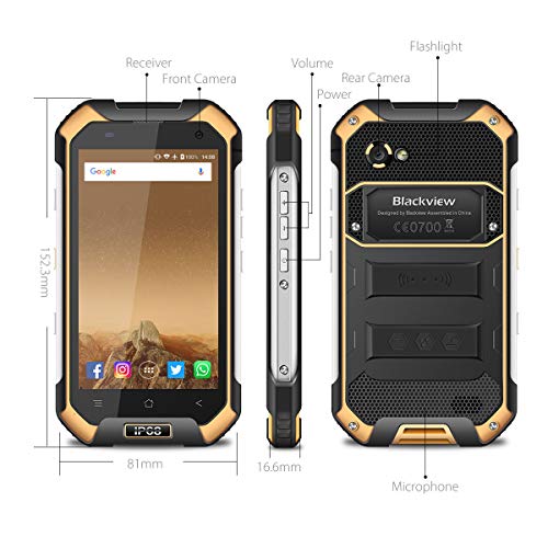 Blackview BV6000S Rugged Smartphone, 16GB ROM e 2GB RAM, 4500mAh Batteria, 2MP+8MP, 4.7" HD, Cellulare Antiurto, IP68 Impermeabile, Dual SIM/GPS/GLONASS/FM/NFC/Fingerprint - Giallo