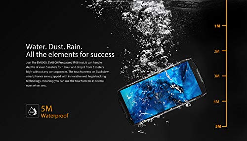 Acqua. Polvere. Pioggia. Ogni elemento per avere il meglio: Proprio come BV600, BV6800 Pro ha passato il test IP68, resiste fino a 5 metri di profondità per 1 ora e cadute da 3 metri di altezza senza conseguenze. Il touchscreen negli smartphone Blackview è equipaggiato con tecnologia di tracciamento delle dita bagnate, consentendoti di utilizzarlo normalmente anche quando bagnato. (IP68 / Impermeabile 5M / Resistente a cadute 3M)--MIL-STD-810G Abbastanza resistente per uso militare