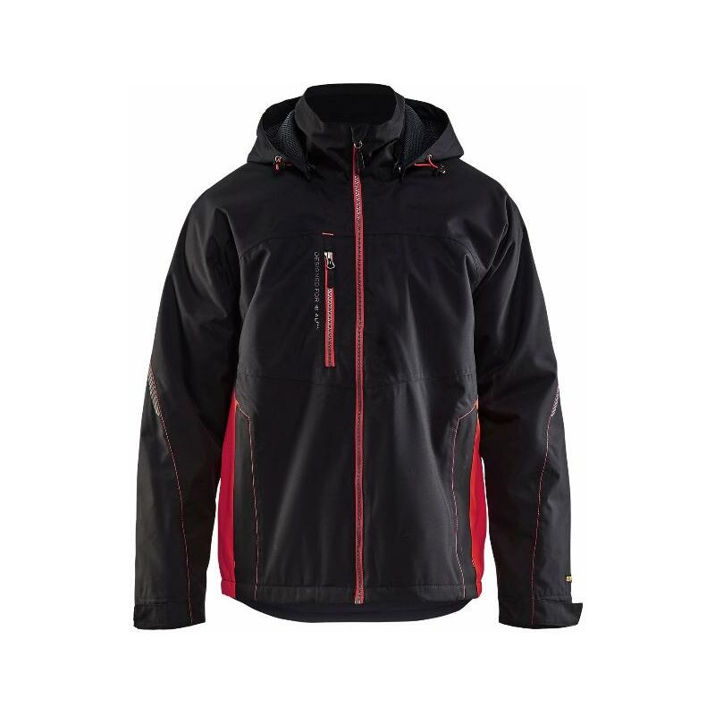 Dettagli: 100% poliestere oxford laminato, impermeabile 15000mm, antivento, traspirante 4000g/m²/24h, Ret 8.5, 200 g/m². Fodera in rete Materiale traspirante antivento e impermeabile, cuciture nastrate Cappuccio rimovibile e regolabile, cappuccio rimovibile con fodera in rete Etichetta tessuta sulla tasca posteriore Stampa sul petto Zip unidirezionale in plastica Tasca sul petto con cerniera Tasche anteriori con cerniera Tasca interna con zip Orlo regolabile con coulisse Polsino interno alla manica con foro per il pollice, estremità della manica regolabile Stampa riflettente su maniche e cappuccio Nero/RossoL